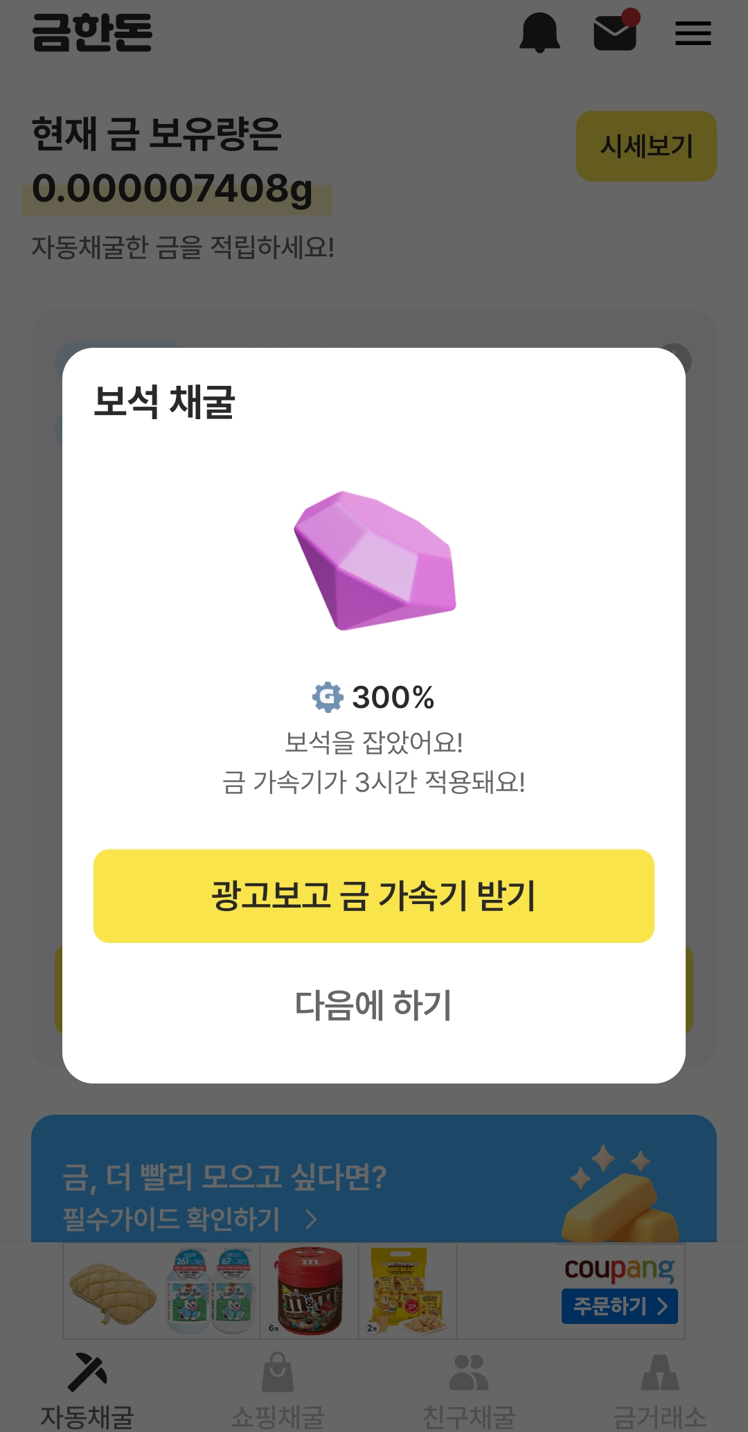 보석 채굴 시 300% 가속기(3시간) : 수락하면 광고 보고 3시간 동안 채굴속도 상승