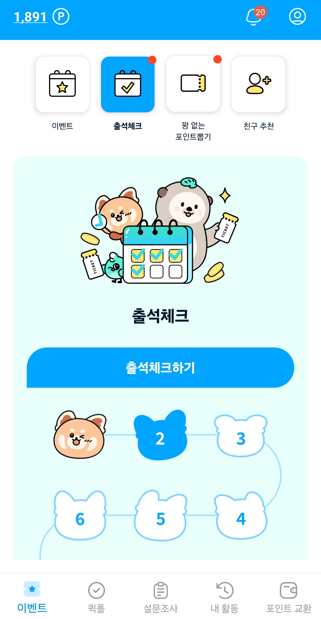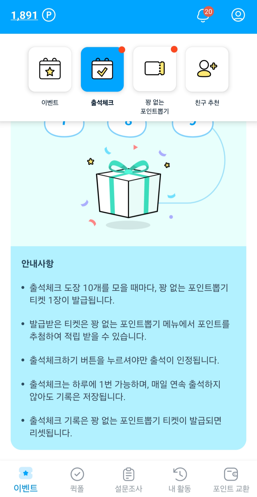 하루 1회 가능, 도장 10개 모으면 뽑기 티켓 1장. 티켓 발급 시 출석 기록은 리셋.