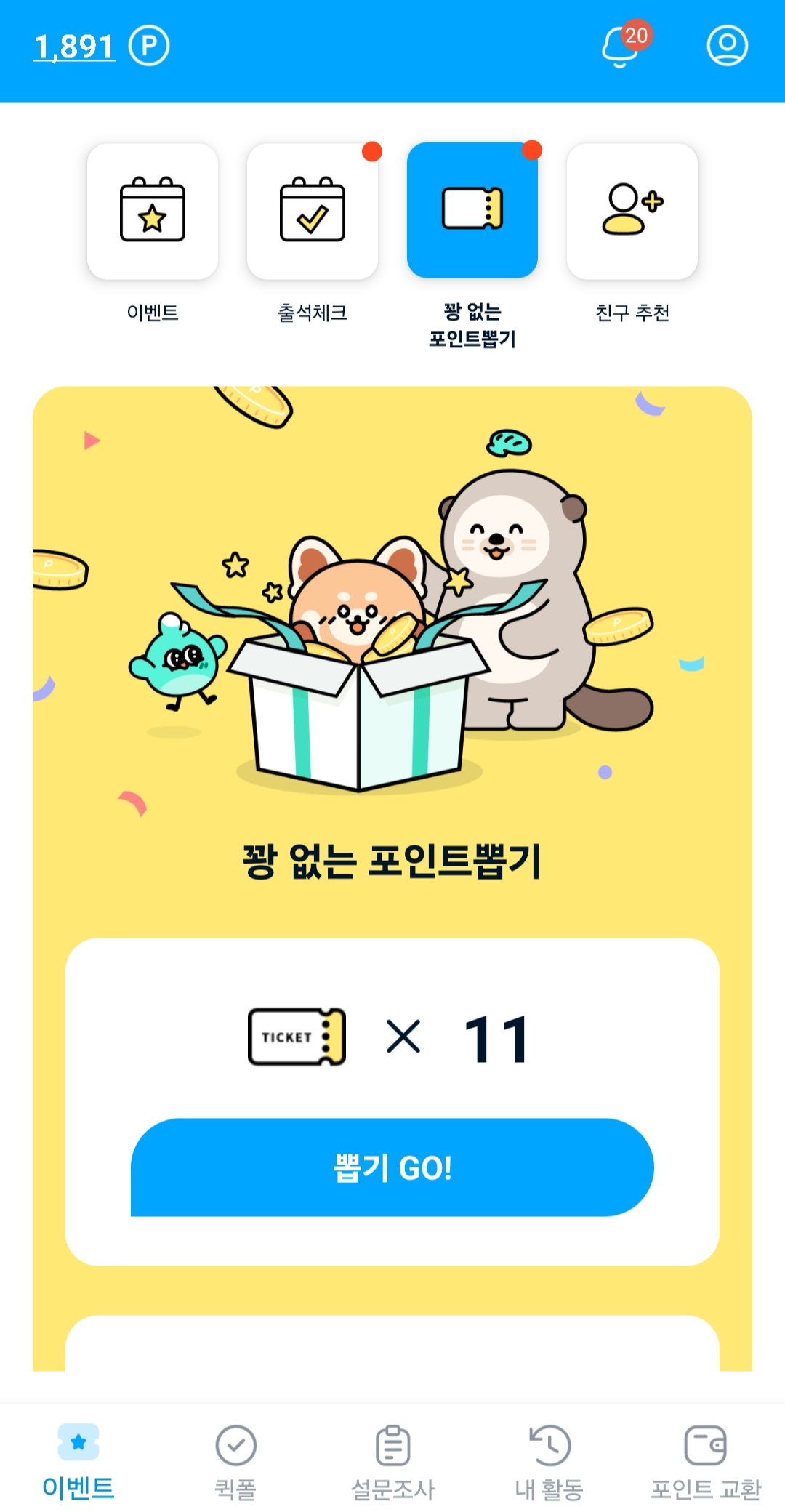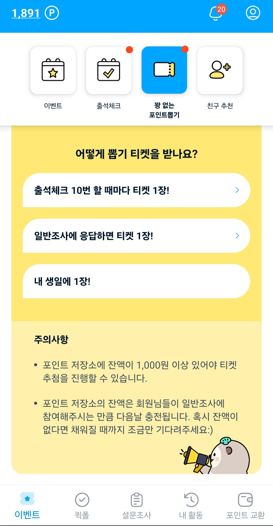 티켓 획득 경로: 출석 10회 / 일반조사 응답 / 생일. 티켓 수량 확인 후 뽑기 GO!