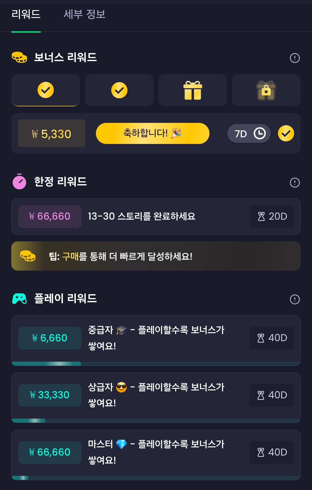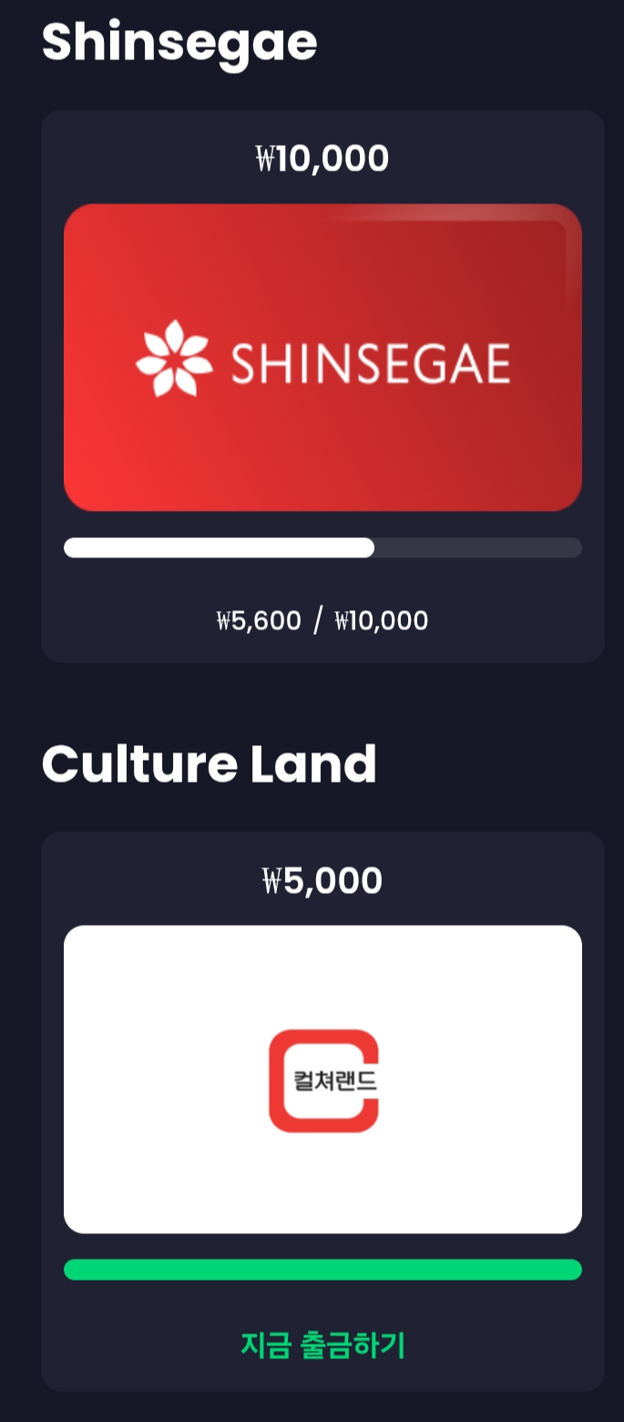 출석만 해도 한 달~50일에 만 원씩 지급하는 게임도 있고, 5만 원씩 높은 보상을 주는 게임도 있지만그 기간 동안 달성하려면 현질이 필요한 게임도 꽤 많음. 그래도 1포인트=1원이라 타 앱보다 리워드 단가가 높은 편.