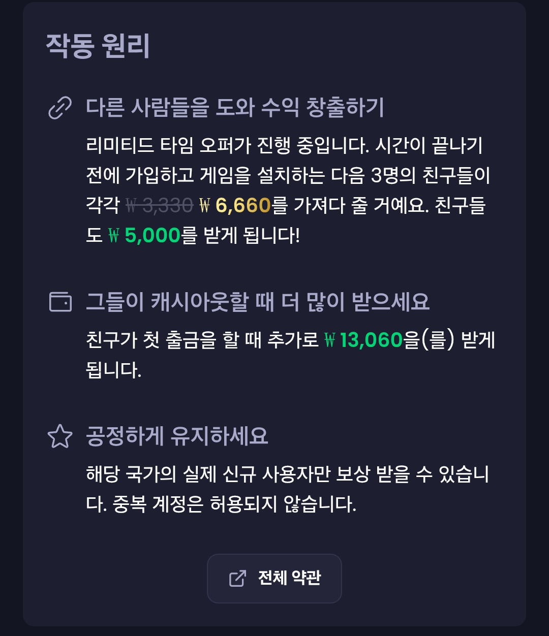 다양한 게임·앱 설치·퀘스트를 완료하고 캐시를 적립하는 리워드 앱테크.출퇴근·쉬는 시간에 미션 몇 개만 깨고 쌓아두면, 일일 보너스/복권/리더보드로 추가 수익까지 노려볼 수 있음.적립한 캐시는 앱 내 출금하기 메뉴를 통해 현금·기프트 카드 등으로 교환 가능.