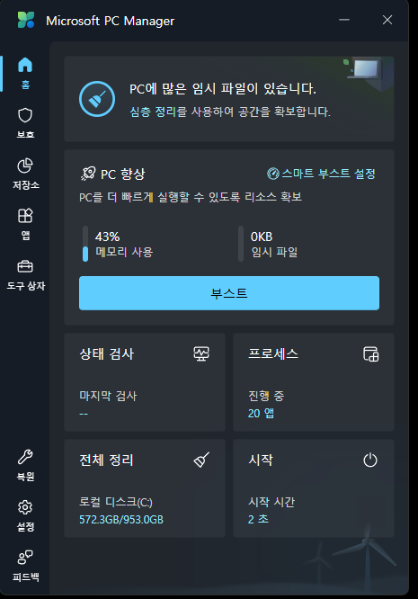 Microsoft PC Manager는 윈도우에서 자주 쓰는 정리/부스트/시작프로그램 관리/팝업 관리 같은 기능을 한 곳에 모아둔 유틸리티 앱
