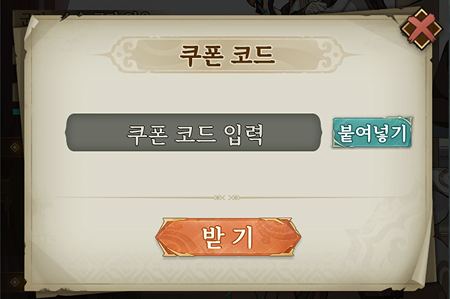 게임 메인화면에서 프로필 → 쿠폰 코드 → 쿠폰번호 입력 순서로 진행됩니다.